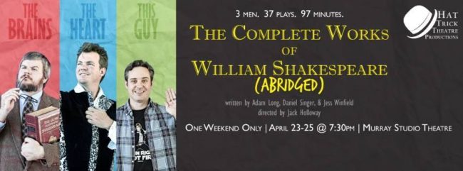 For one weekend only, Hat Trick Theatre is taking on the Bard: 3 men, 37 plays, 97 minutes –what could go wrong? In one foul swoop (with a 15 minute intermission) our heroes will attempt to cover the comedies, tackle the tragedies, and hash out the histories of William Shakespeare. (We might even let out…